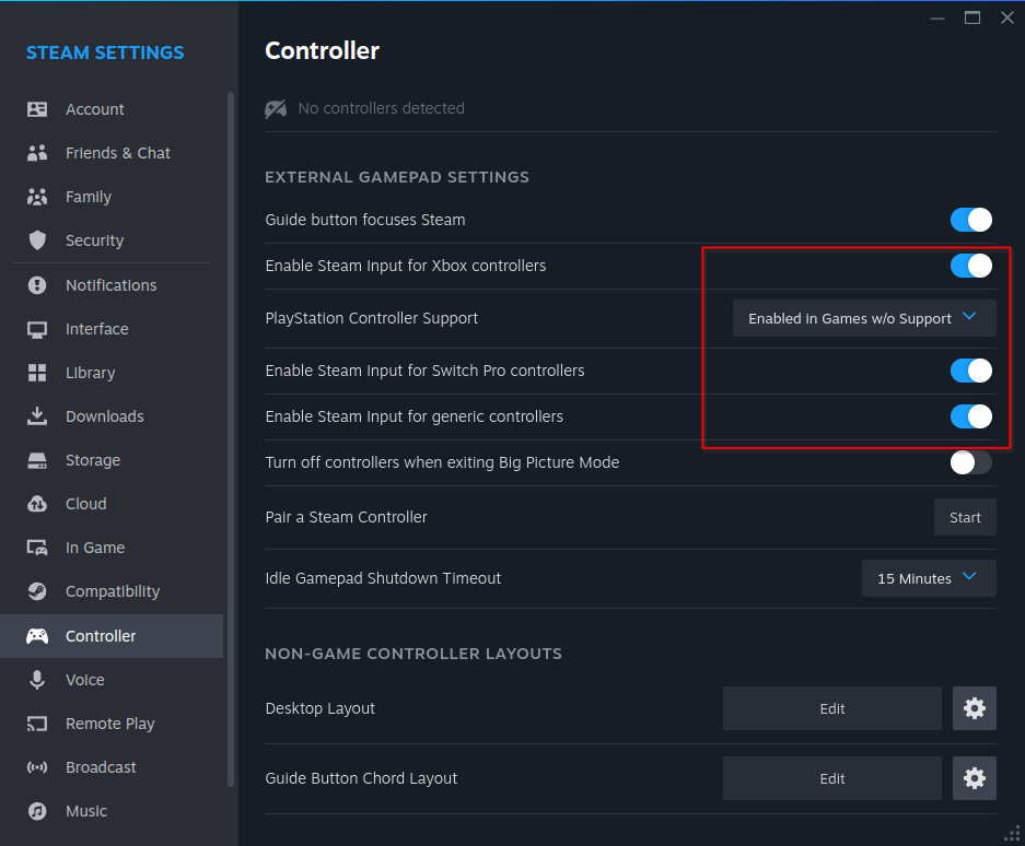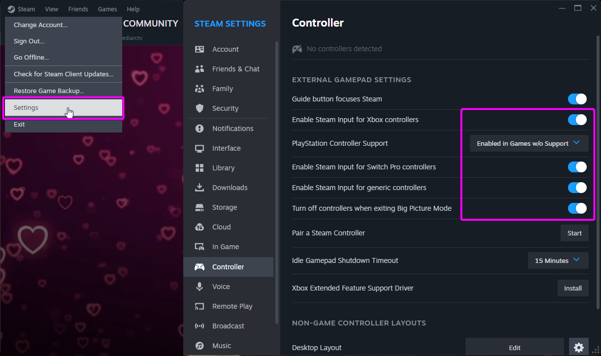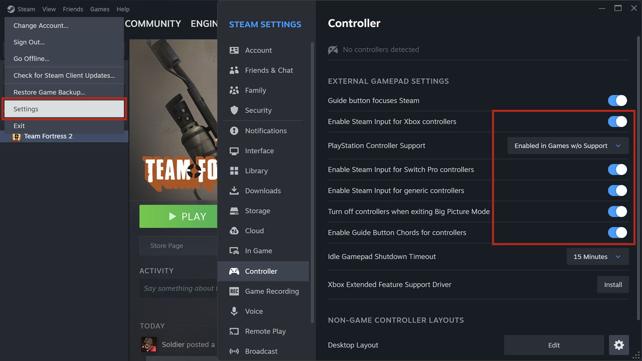 A visual guide to choose and enable which controller type to use on the Steam Client.