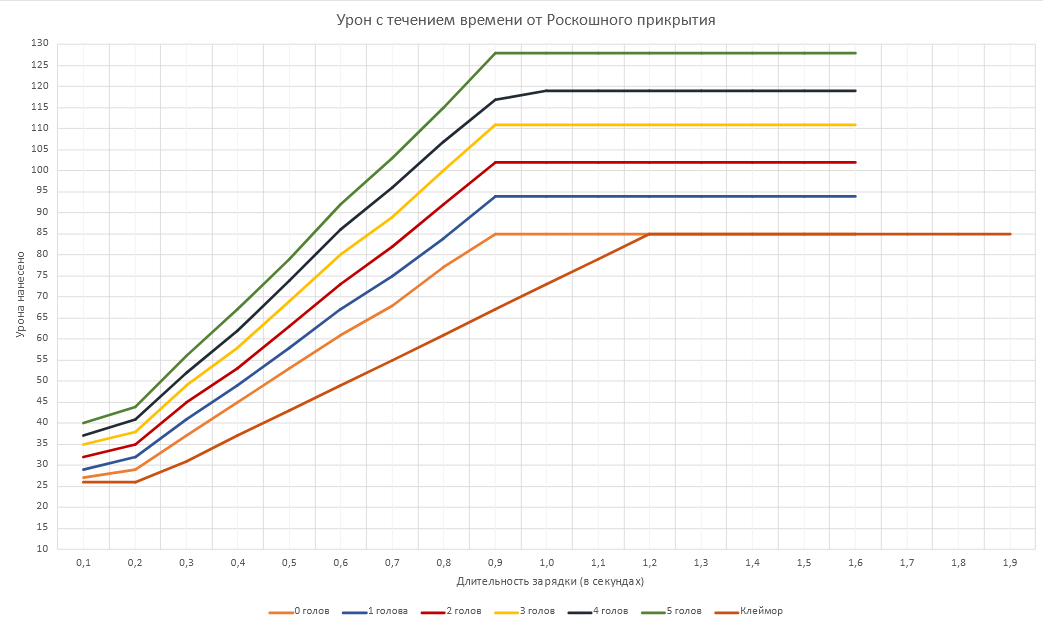 A chart to display the charging damage done by the Splendid Screen at different ranges. Based on in-game testing.