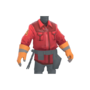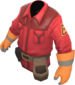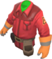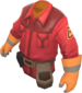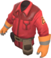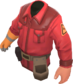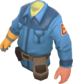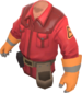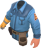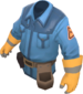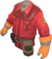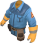The Technician's Tunic is a community-created cosmetic item for the Engineer. It is a team-colored trench coat worn over the Engineer's tool belt, with a triangular Engineer class emblem on each arm, a second glove matching the one on his right hand, and a dark sweater underneath.