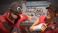 - There is a hidden note inside the textures for the Shocked style, featuring a crudely drawn Soldier yelling, with the caption "Yelling Idiot!". While not visible in-game, it has been used in one of the promotional materials featured on the item's Workshop page.
