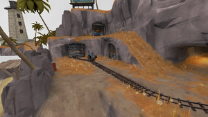 - Caves: There is a small cave system on the right of the cliff. The caves have one entrance which is positioned on the right side of the cart tracks, right in front of the cliffs, once inside, the caves proceed to branch out into two more caves which lead into different directions. One of the caves leads to the cliff, thus giving BLU access to them while the other cave leads to the mini van parking space.